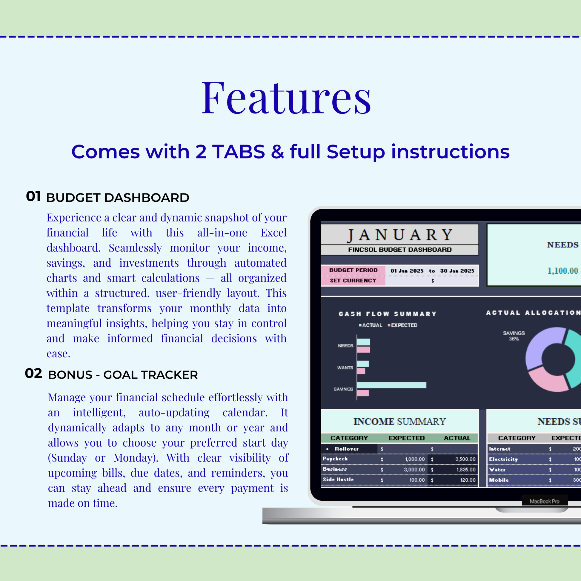 • One main tab: the 50/30/20 Budget Dashboard