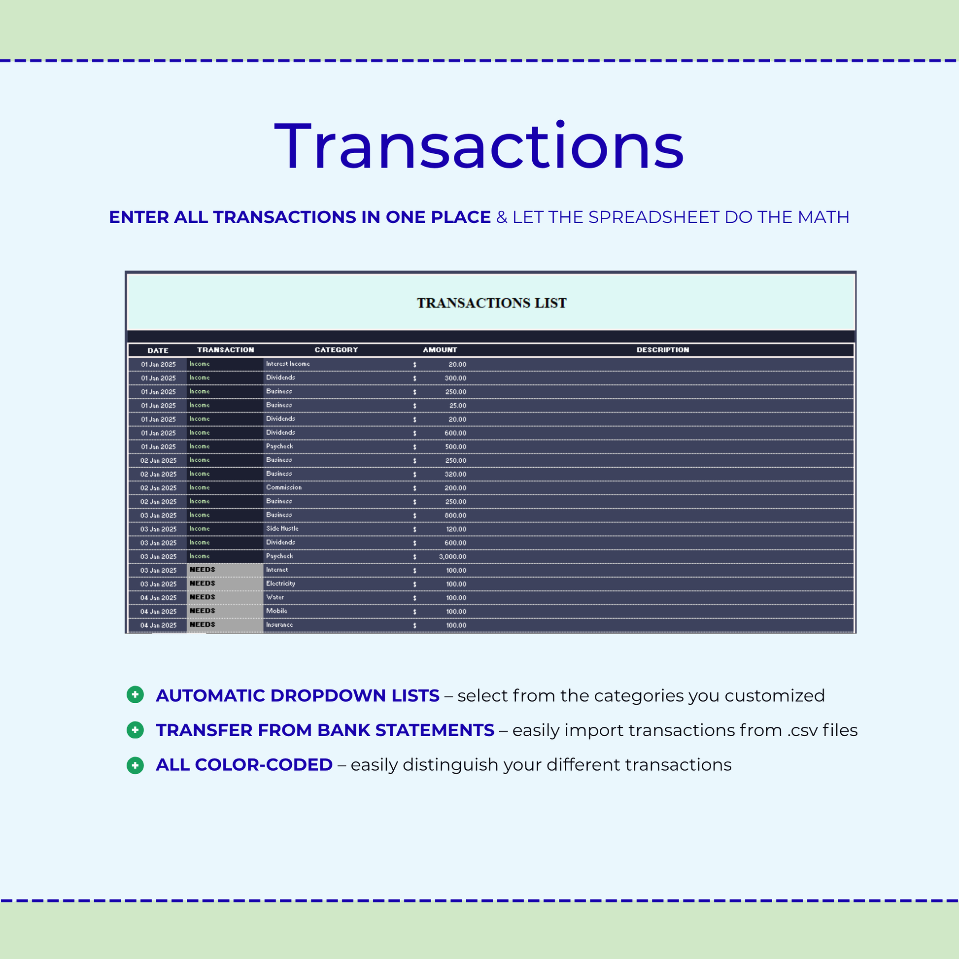 • Fully customizable 50/30/20 ratio (also supports the 70/20/10 rule)