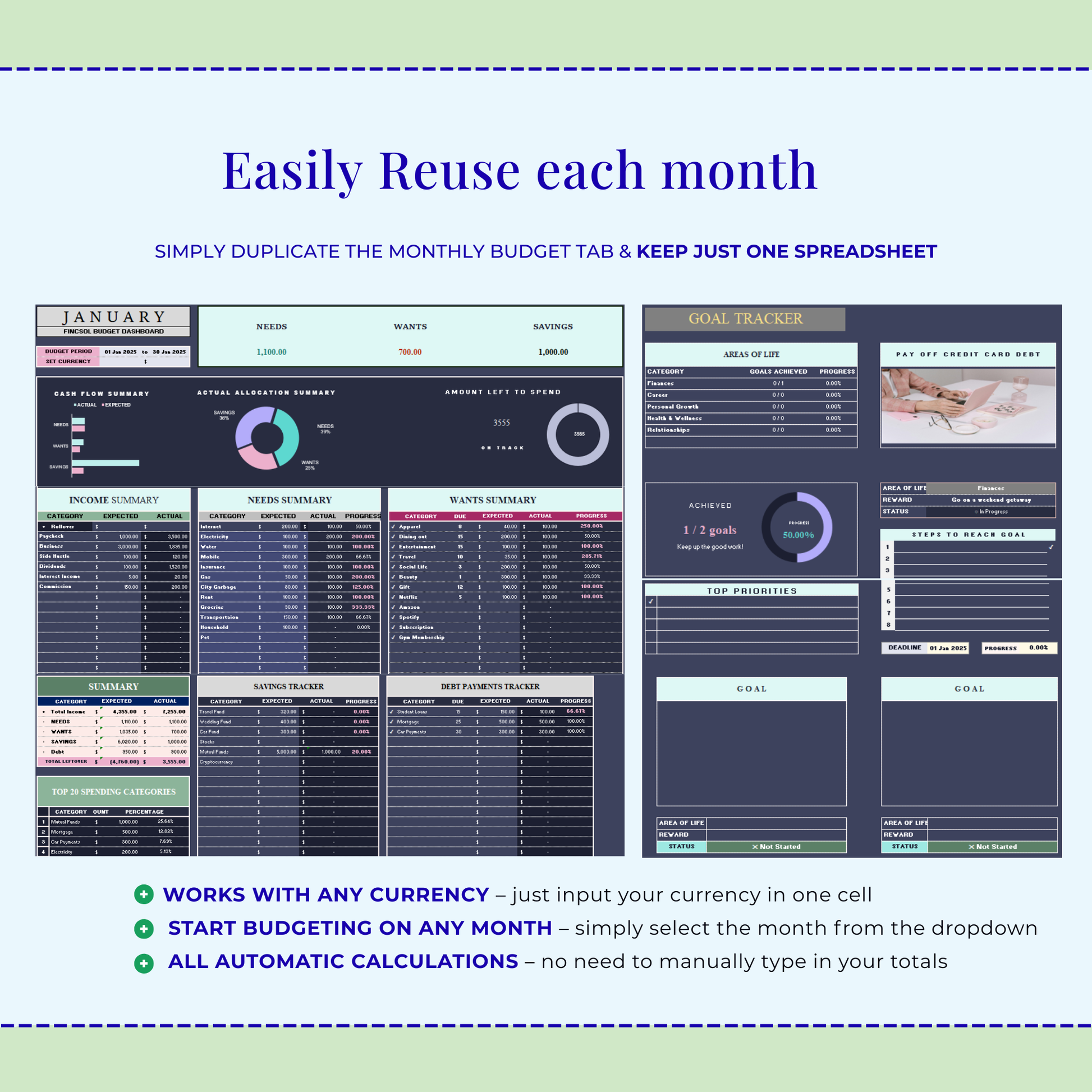 • Works with all currencies — update one cell and you’re ready