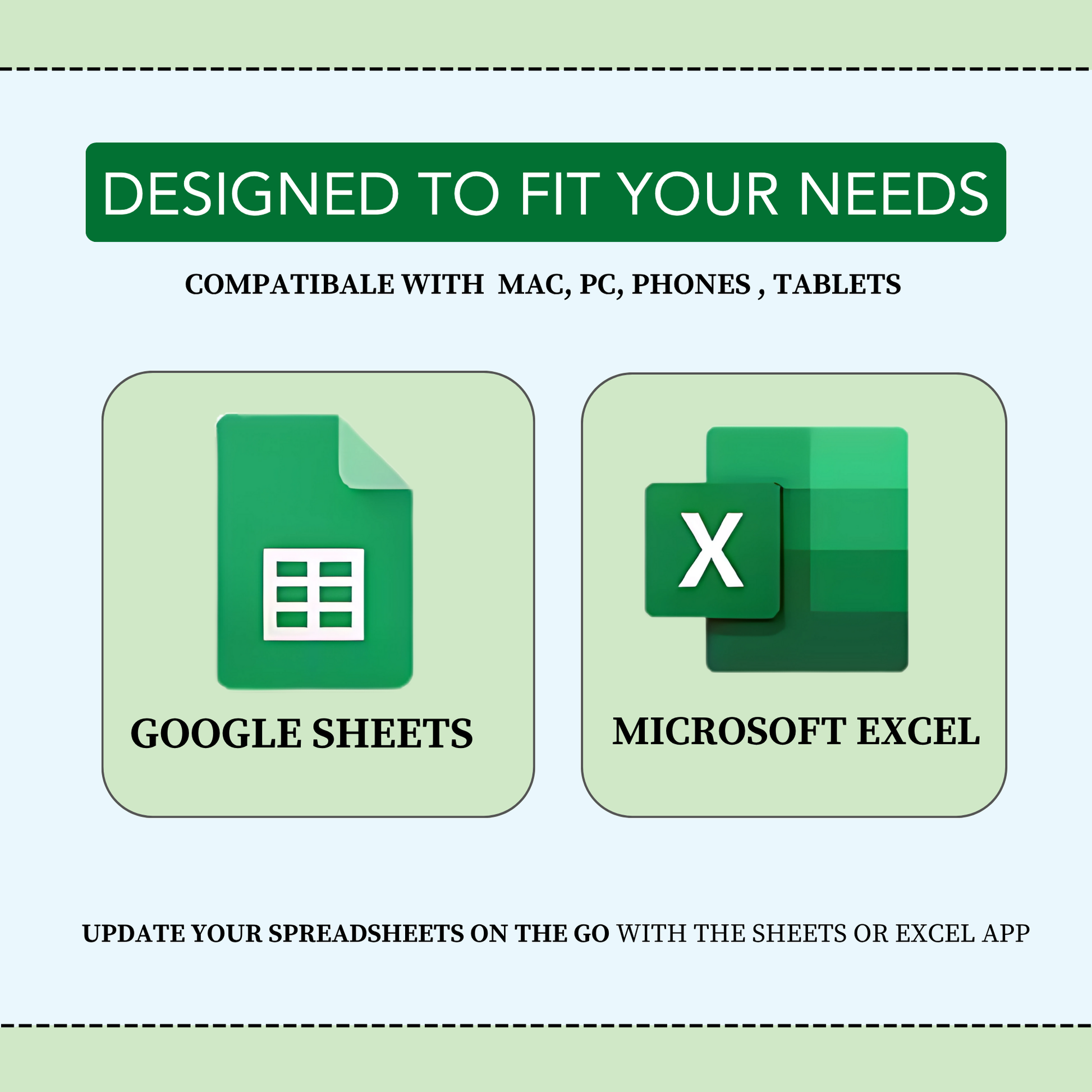 All contents are copyright of fincsol. Purchasing grants a personal-use license only. Redistribution, resale, or sharing of any part is strictly prohibited. Due to digital nature, all sales are final. Please contact us if you face any issues. Color variations may appear on different devices. Sample data shown in listing images is for demonstration only — spreadsheet is provided blank for your own data.