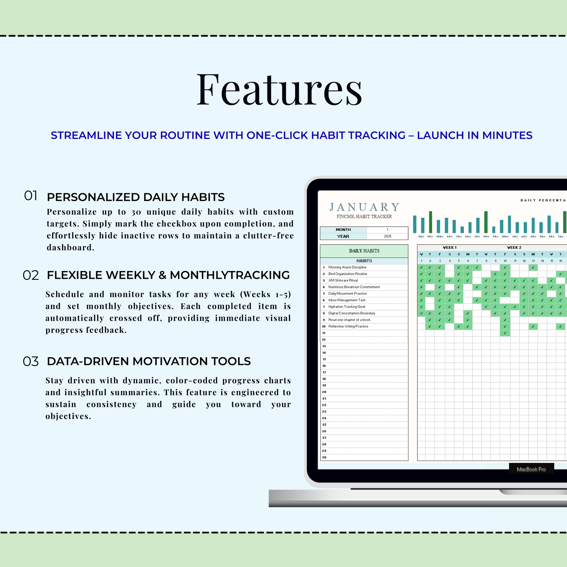 • One complete Habit Tracker Spreadsheet