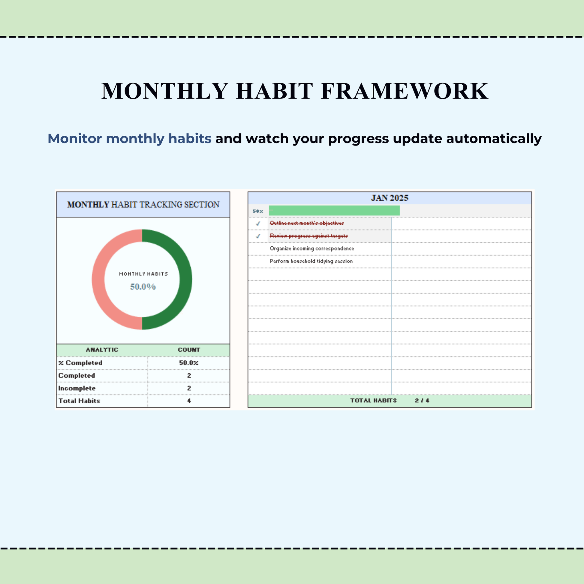 The Simple Habit Tracker includes only what you need—clean layout, clear structure, and automatic calculations—making it beginner-friendly and visually appealing. Just customize your habits, tick the checkboxes, and let the Daily Habit Tracker, Weekly Habit Tracker, and Monthly Habit Tracker do the rest automatically.