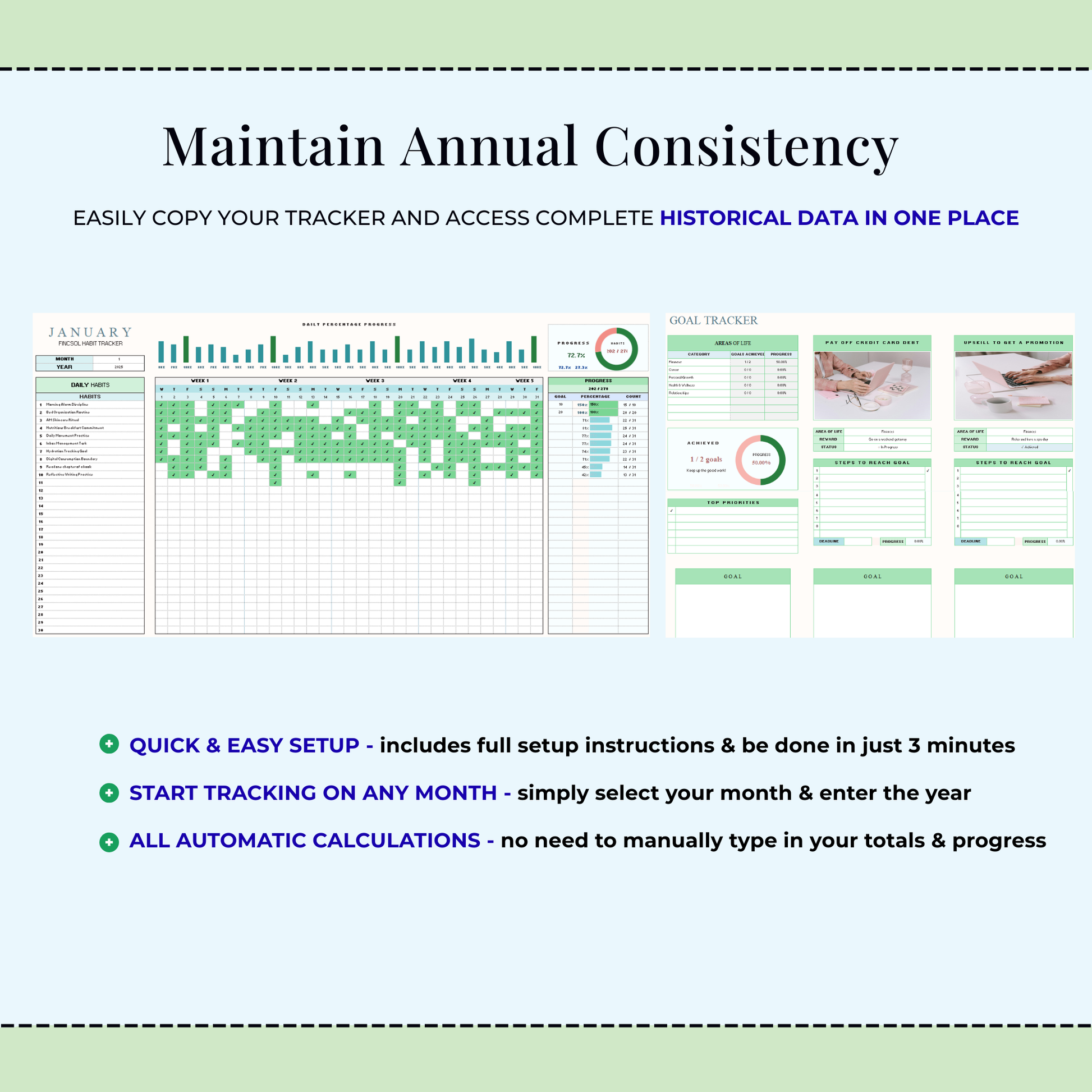 • BONUS: Goal Tracker for weekly, monthly, and yearly goals